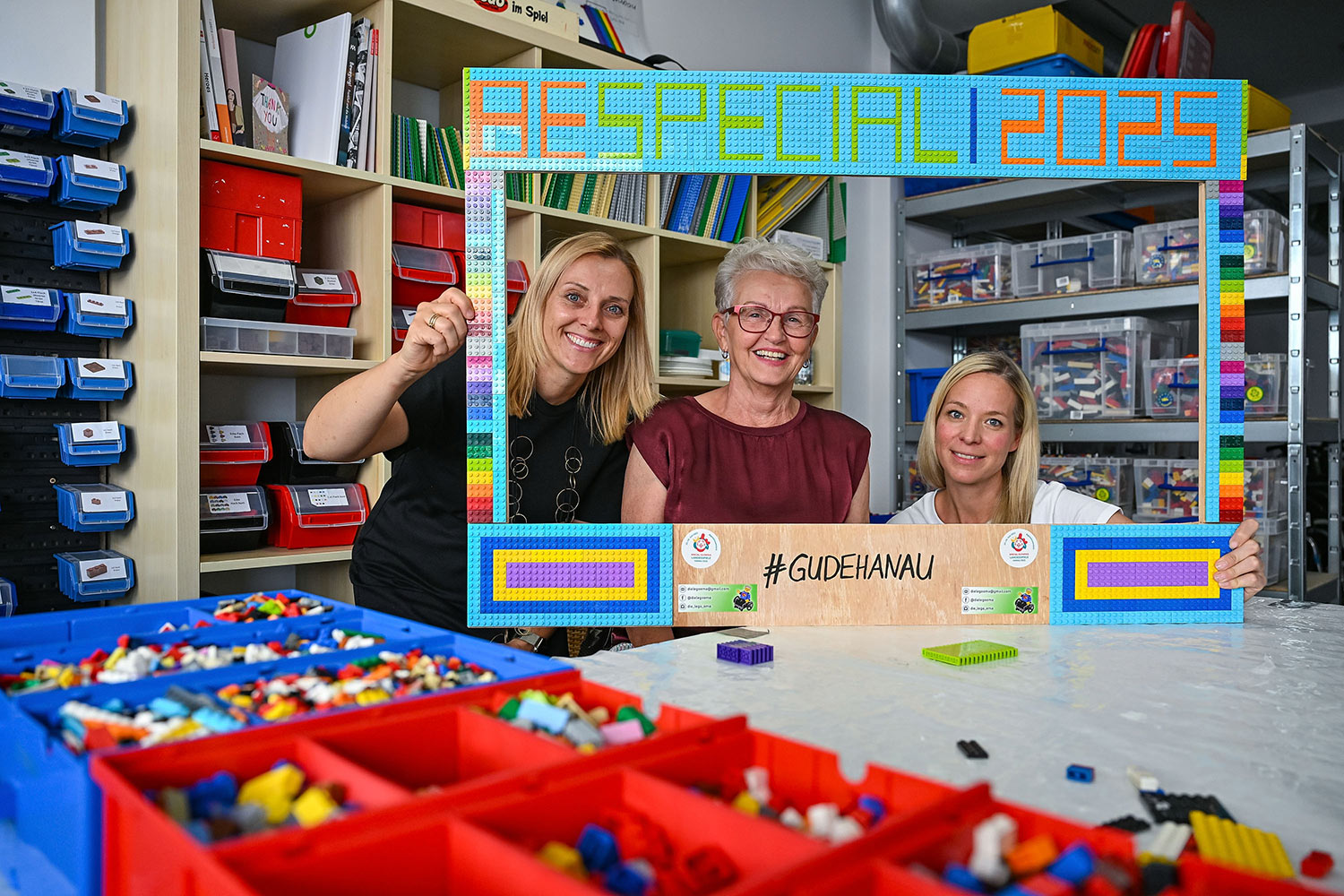 (v.l.n.r.) Julia Steinecker (Fachstelle Sport der Stadt Hanau), Lego-Oma Rita Ebel und Sandra Osthues (Lehrerin an der Elisabeth-Schmitz-Schule) zeigen, wie der Selfie-Rahmen aus Legosteinen genutzt wird.