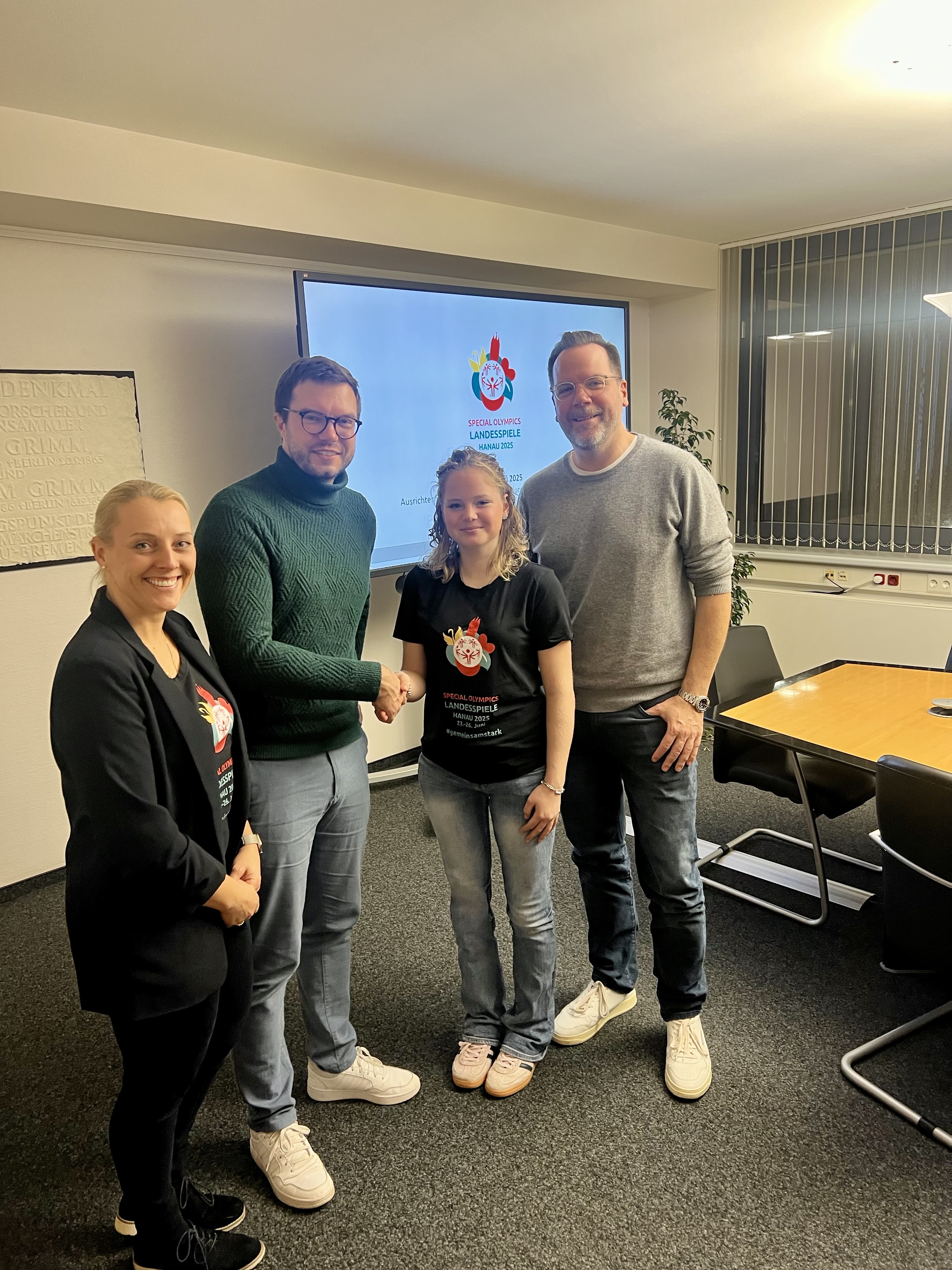 V.l.n.r.: Julia Steinecker, Fachstelle Sport der Stadt Hanau, Bürgermeister Dr. Maximilian Bieri, Annika Wein und Henrik Statz, Vorstand THC Hanau freuen sich auf die Special Olympics 2025 in Hanau.