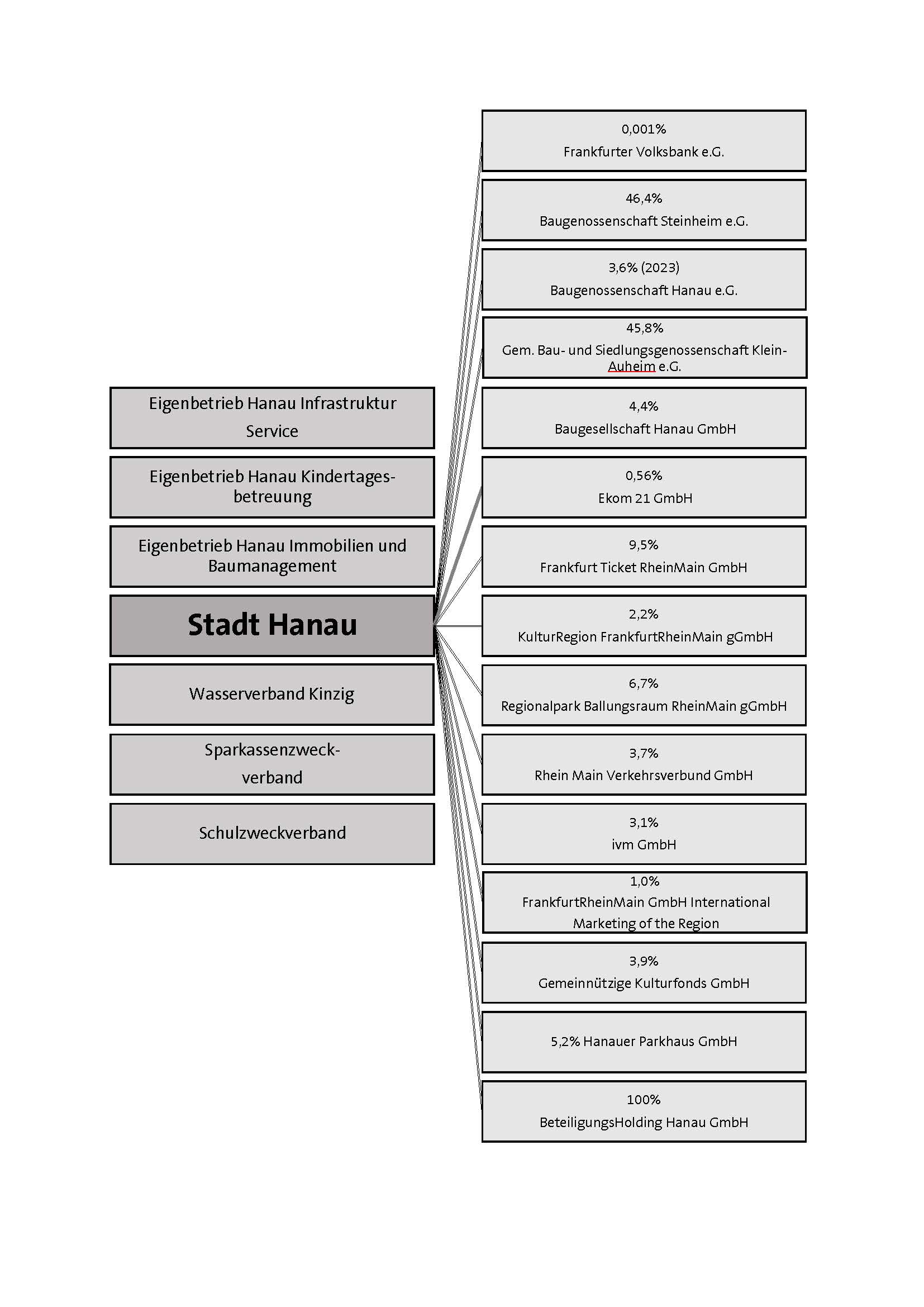 Zur Erfüllung ihrer Aufgaben im Rahmen der Daseinsvorsorge hat die Stadt Hanau kommunale Eigenbetriebe eingerichtet, privatrechtliche Gesellschaften gegründet und ist an zahlreichen Unternehmen beteiligt.