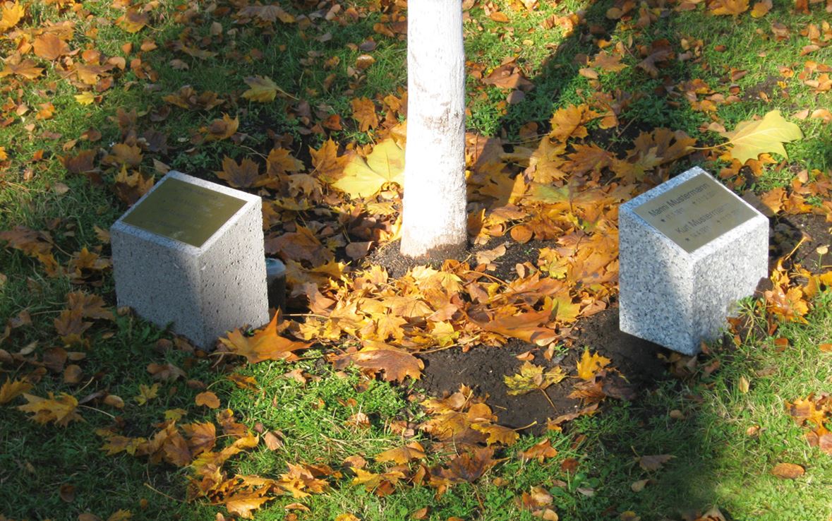 gewünscht. Ein Namensschild am gemeinschaftlichen Grabmal
