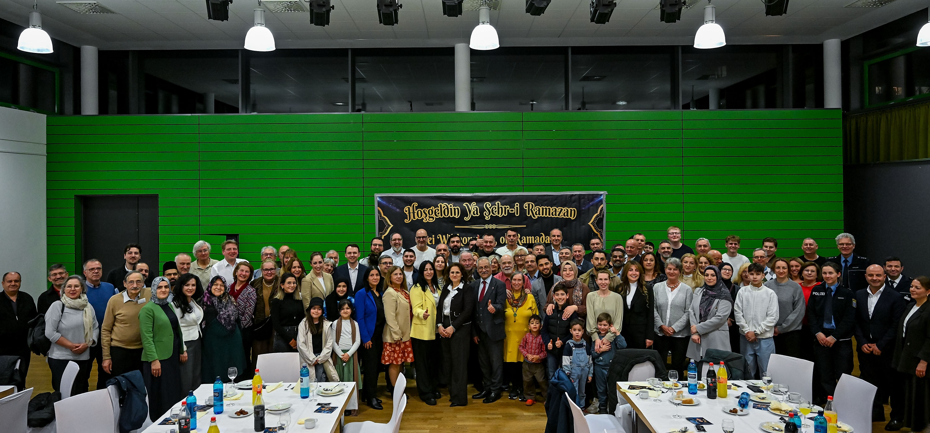 Die hessische Integrationsstaatssekretärin Katrin Hechler übergab am Rande des Fastenbrechens den Bescheid über 600.000 Euro: Das Land setzt die Förderung der WIR-Vielfaltszentren im Rahmen des Landesprogramms "WIR – Vielfalt und Teilhabe" fort. Auf den an diesem Morgen im Nahen Osten begonnen Krieg gingen sowohl der Hanauer Bundesabgeordnete Pascal Reddig als auch der türkische Vizekonsul Gökay Öztürk ein, die Bedeutung des Dialogs in Zeiten gesellschaftlicher Spannungen hervorhoben. Als "Zeit des Innehaltens" und "Moment der Nächstenliebe" beschrieb Imam Mustafa Bozkurt vom islamischen Verein Hanau den Fastenmonat. Pünktlich zum Sonnenuntergang sprach er das Gebet zum Fastenbrechen und leitete damit den gemeinsamen Abend, das gemeinsame Essen ein.