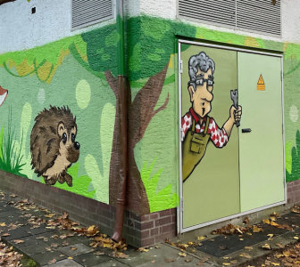 Senioren-Graffiti-Gruppe „Sprayground Old Robinson“ gestaltet Trafostation an der Wolfstraße im Stadtteil Wolfgang mit künstlerischen Bildern von Dachs, Bär, Fuchs, Igel, Marder und Biber.Rapunzelturm in Hanau