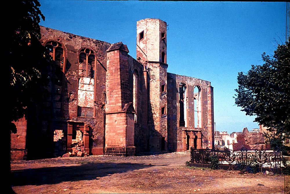 Innenraum der zerstörten Wallonisch-Niederländischen Kirche Hanau 1945