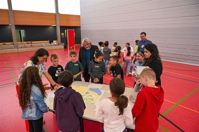 Rund 60 Dritt- und Viertklässler der Pestalozzischule, Brüder Grimm-Schule, Tümpelgartenschule und Gebeschusschule folgten der Einladung von Gökben Akdemir, der Leiterin des Kinder- und Jugendbüros. Akdemir und die Kinder sowie die Schulleitungen der jeweiligen Schulen, Hauke Wessels von HIS und Harald Kirschenlohr vom Architekturbüro für Garten- und Landschaftsplanung starteten den Tag im Schlossgarten mit einer gemeinsamen Begehung des alten Spielplatzes Schlossgarten I nahe der Eugen Kaiser Straße. Dieser brannte im Jahr 2021 zum Teil ab und soll nun erneuert werden. Anschließen ging es weiter zur Turnhalle der Pestalozzischule, wo sie von Bürgermeister Dr. Maximilian Bieri und Schulleiter Stefan Weidner sowie Hauke Wessels, HIS-Projektleiter für Spielplätze, herzlich begrüßt wurden.