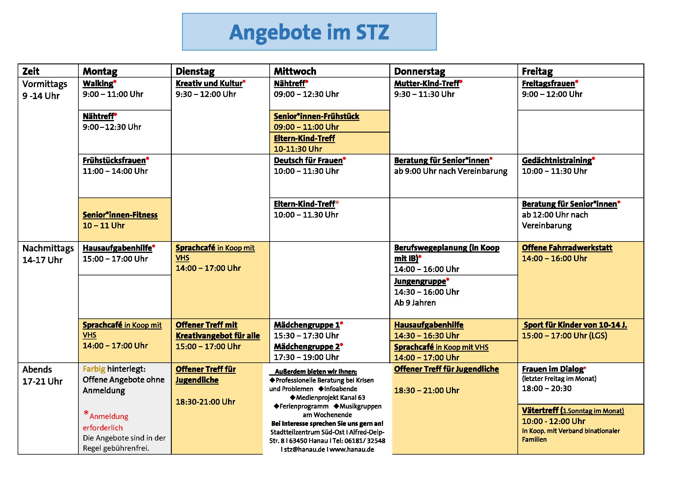 Das Stadtteilzentrum ist eine Einrichtung mit der Aufgabe, die Toleranz und das Zusammenleben der unterschiedlichen nationalen, ethnischen Bevölkerungsgruppen und Kulturen im Stadtteil Süd-Ost zu fördern. Ziel ist es, alle hier lebenden Menschen anzusprechen, um die Lebensqualität in diesem Stadtteil zu verbessern. Die Arbeit des Stadtteilzentrums ist auf drei Säulen aufgebaut. Sozialer Gruppenarbeit, Beratung und Gemeinwesen Arbeit und es ist Ansprechpartner für alle Menschen im Stadtteil Süd-Ost.