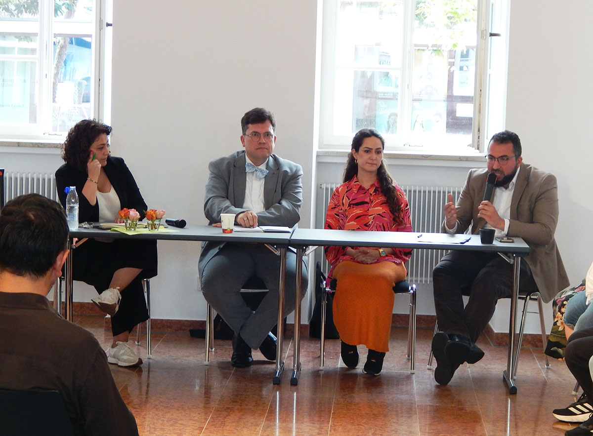 Donja Banai, Leiterin des Evangelischen Forums Hanau, Imam Macid Bozkurt vom Islamischen Verein Hanau sowie Emel Aygün von der Alevitischen Gemeinde Hanau und Umgebung tauschten sich in einem Podiumsgespräch dazu aus, wie man trotz Unterschiede „zusammen leben“ und „zusammen wachsen“ kann. Die Moderation übernahm Dr. Ralf Grünke von der Kirche Jesu Christi der Heiligen der Letzten Tage.